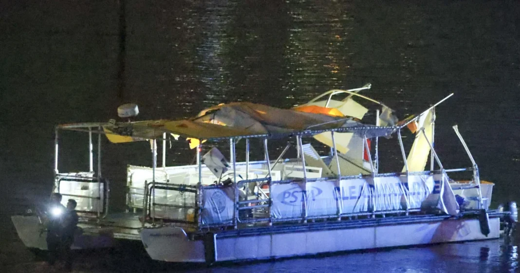 Investigators search the wreckage of a Clearwater Ferry after a boat crashed into the ferry causing multiple injuries near the Clearwater Memorial Causeway Bridge, in Clearwater, Fla., on Sunday, April 27, 2025. (Douglas R. Clifford/Tampa Bay Times via AP)