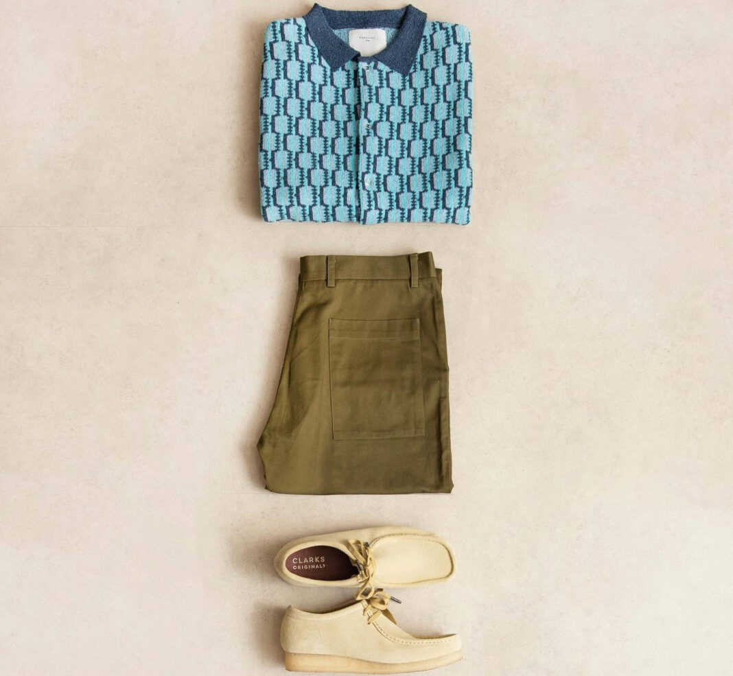Next, green socks. Substitute those for these very light brown socks by Uniqlo (literally the only place worth buying socks from), which I would have worn if my girlfriend didn’t always steal them from me. I’m wearing sage green Basic Rights trousers, which again are no longer in production, but these “wide fit” trousers by Folk are a stellar substitute.