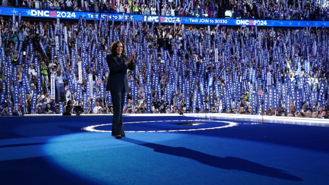 Democratic presidential nominee and U.S. Vice President Kamala Harris takes the stage on Day 4 of the Democratic National Convention (DNC) at the United Center in Chicago, Illinois, U.S., August 22, 2024.Â