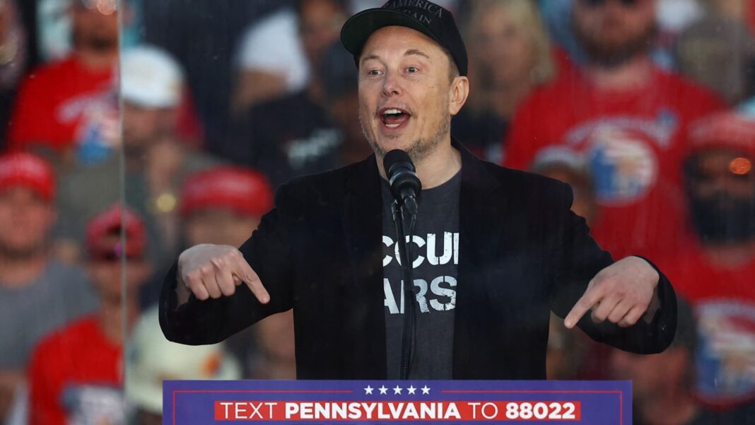 Tesla CEO Elon Musk speaks during a rally for Republican presidential nominee and former U.S. president Donald Trump, at the site of the July assassination attempt against Trump, in Butler, Pennsylvania, on Oct. 5, 2024.