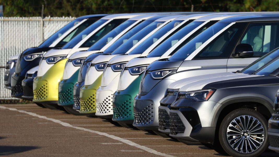 Rows of Volkswagen ID Buzz electric buses are parked at the National City Marine Terminal, a major port for vehicle imports and exports to the U.S.