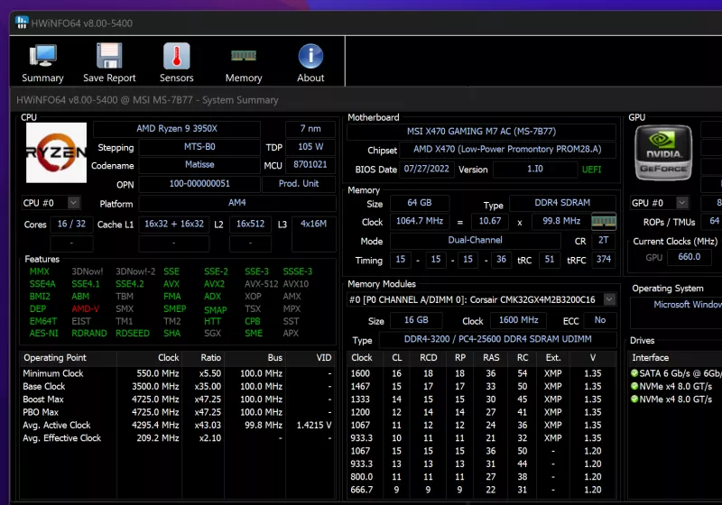 HWiNFO is designed to report detailed hardware information alongside real-time monitoring of system sensors. It reports granular data for CPUs, GPUs, memory, storage, and motherboards, including temperatures, clock speeds, voltages, power draw, and throttling behavior.