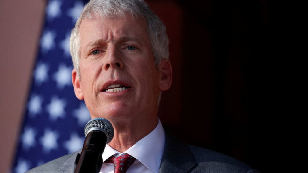 U.S. Energy Secretary Chris Wright and Venezuela’s interim President Delcy Rodriguez, not pictured, speak with the media after attending a meeting, marking the highest-level U.S. visit focused on energy policy to the OPEC nation in nearly three decades, as Washington conducts its first on-the-ground assessment of the oil industry it aims to help rebuild, in Caracas, Venezuela, February 11, 2026.