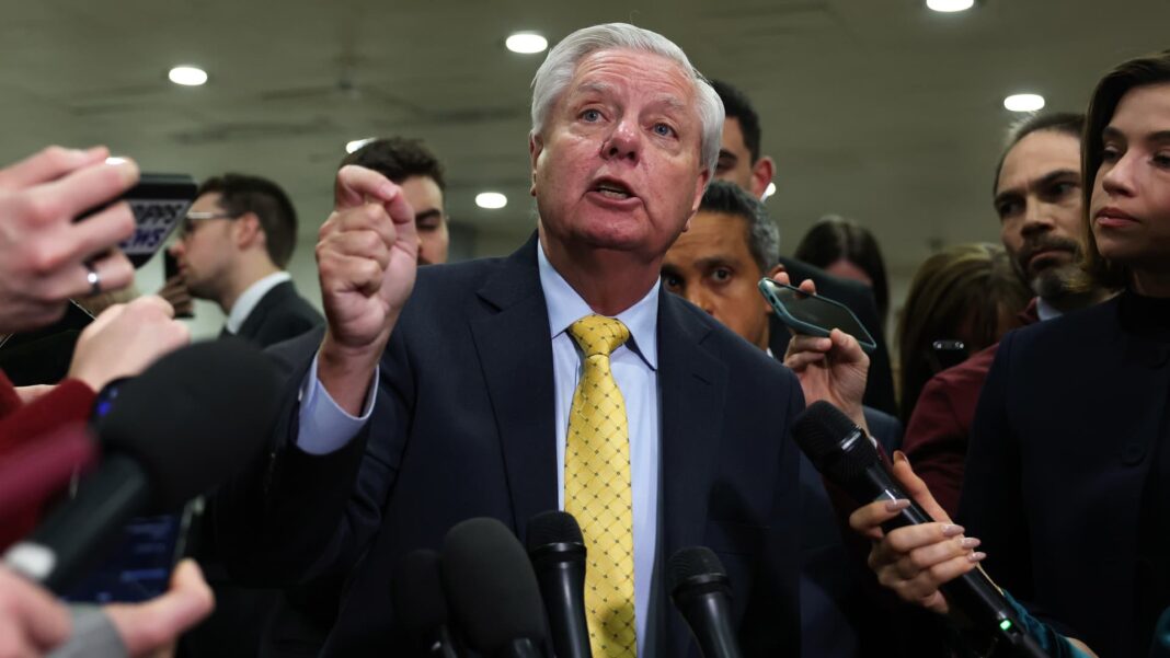 U.S. Sen. Lindsey Graham (R-SC) speaks to members of the media as the Trump Cabinet briefs members of Congress on Iran at the U.S. Capitol on March 3, 2026 in Washington, DC.