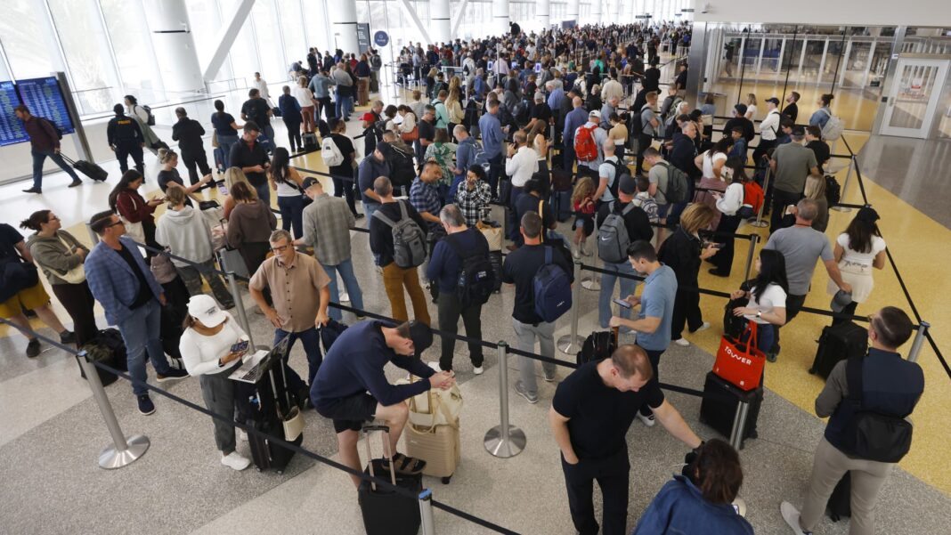 San Diego, CA – March 23: Travelers stand in a long Transportation Security Administration (TSA) line that wrapped throughout Terminal 1 at San Diego International Airport on March 23, 2026 in San Diego, CA.