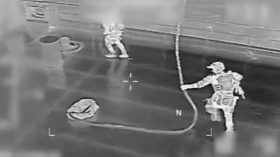 Noem posted a brief video that appeared to show part of the ship’s capture. The black-and-white footage showed helicopters hovering over the deck of a merchant vessel while armed troops dropped down on the deck by rope.