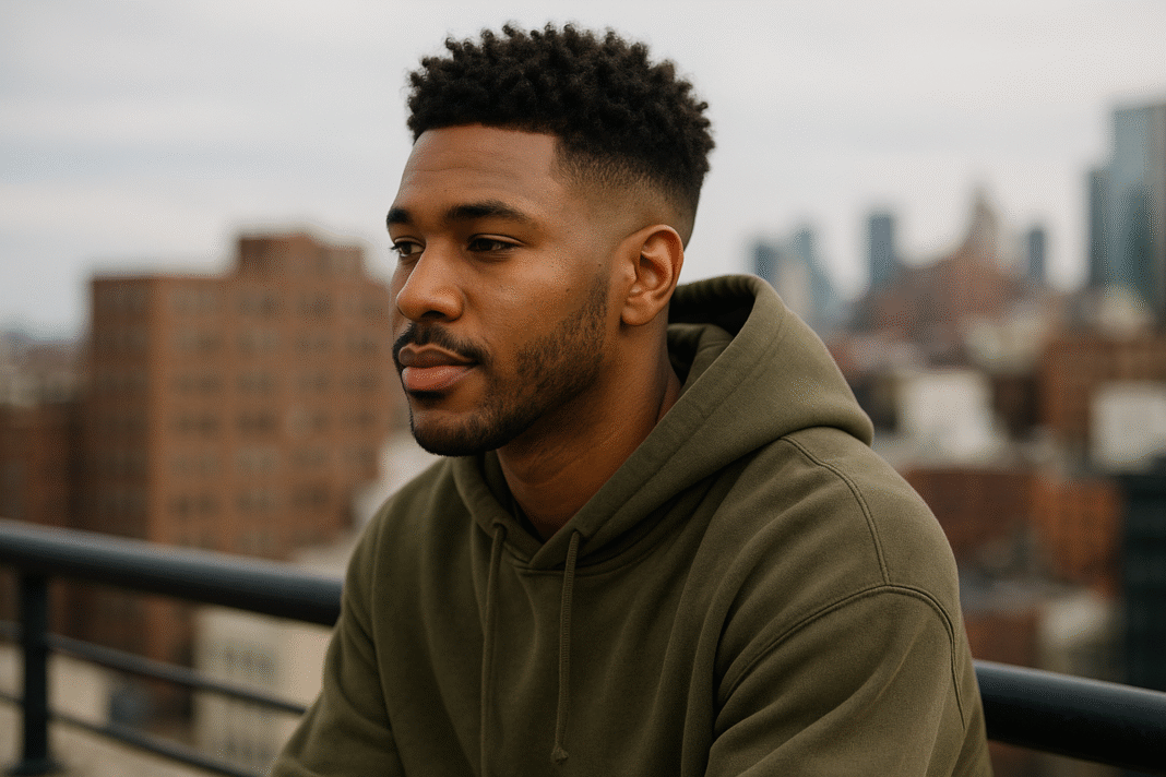 The Textured High Fade marries a bold fade with freeform, textured hair on top, creating a dramatic, high-impact profile. This haircut is characterized by abrupt, high fading on the sides, drawing attention to the fullness and texture of the top layers of hair. The top can be styled into natural waves or curls, enhancing movement and depth. Versatile for both business and nightlife, this style is a staple in modern grooming scenes and influenced by celebrities like Michael B. Jordan.