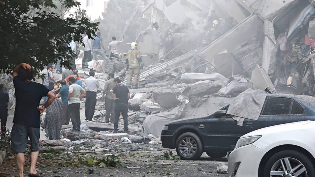 People look over damage to buildings in Nobonyad Square following Israeli airstrikes on June 13, 2025 in Tehran, Iran.
