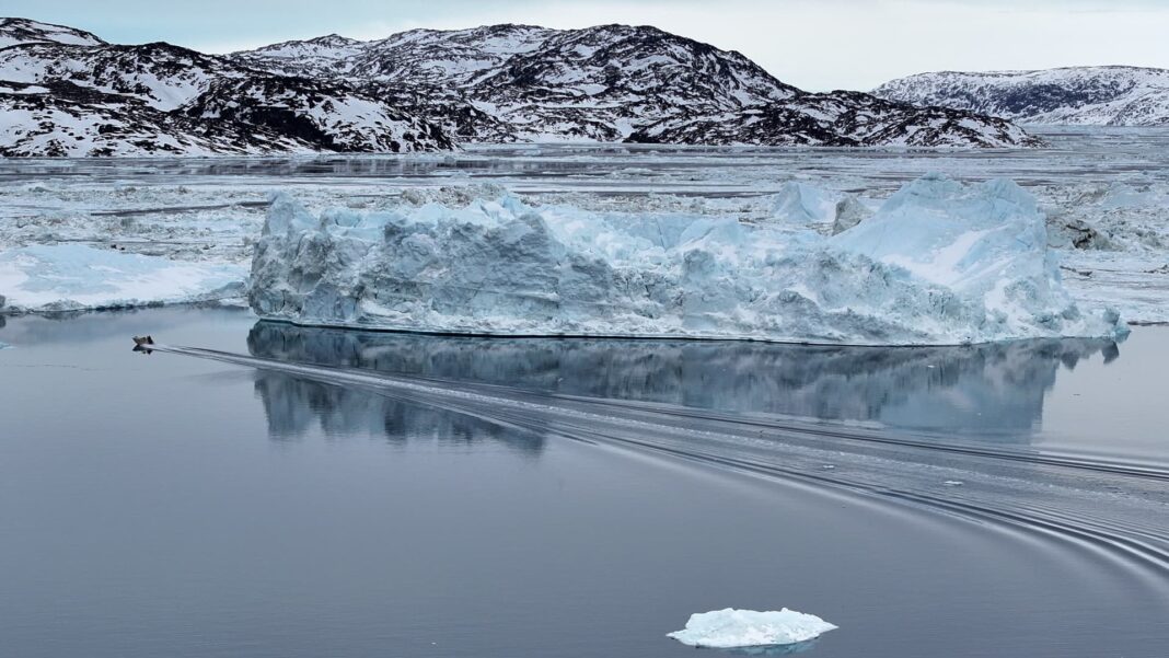 A fishing boat navigates around icebergs that broke off from the Jakobshavn Glacier and are floating in Disko Bay on March 10, 2025, in Ilulissat, Greenland.